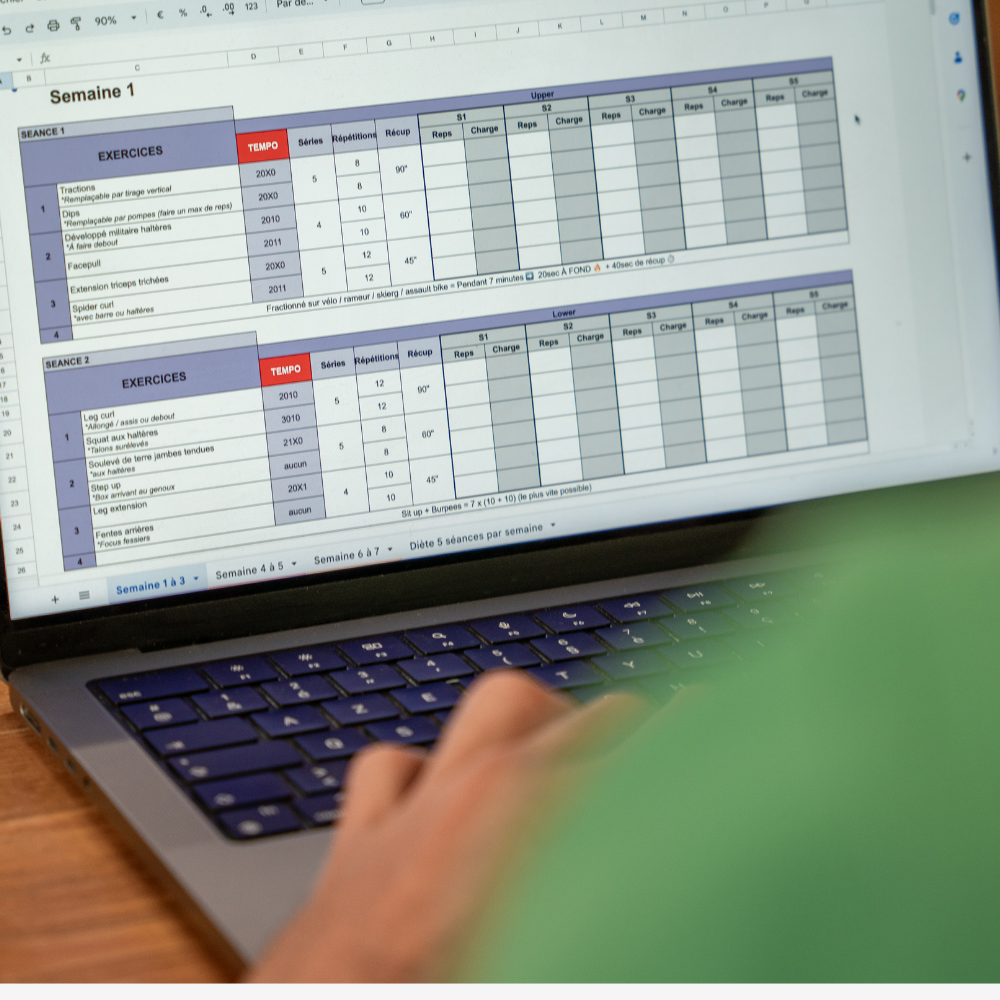 Un carnet d’entraînement Excel et un calculateur nutritionnel, pour suivre votre progression et rester concentré sur votre objectif.